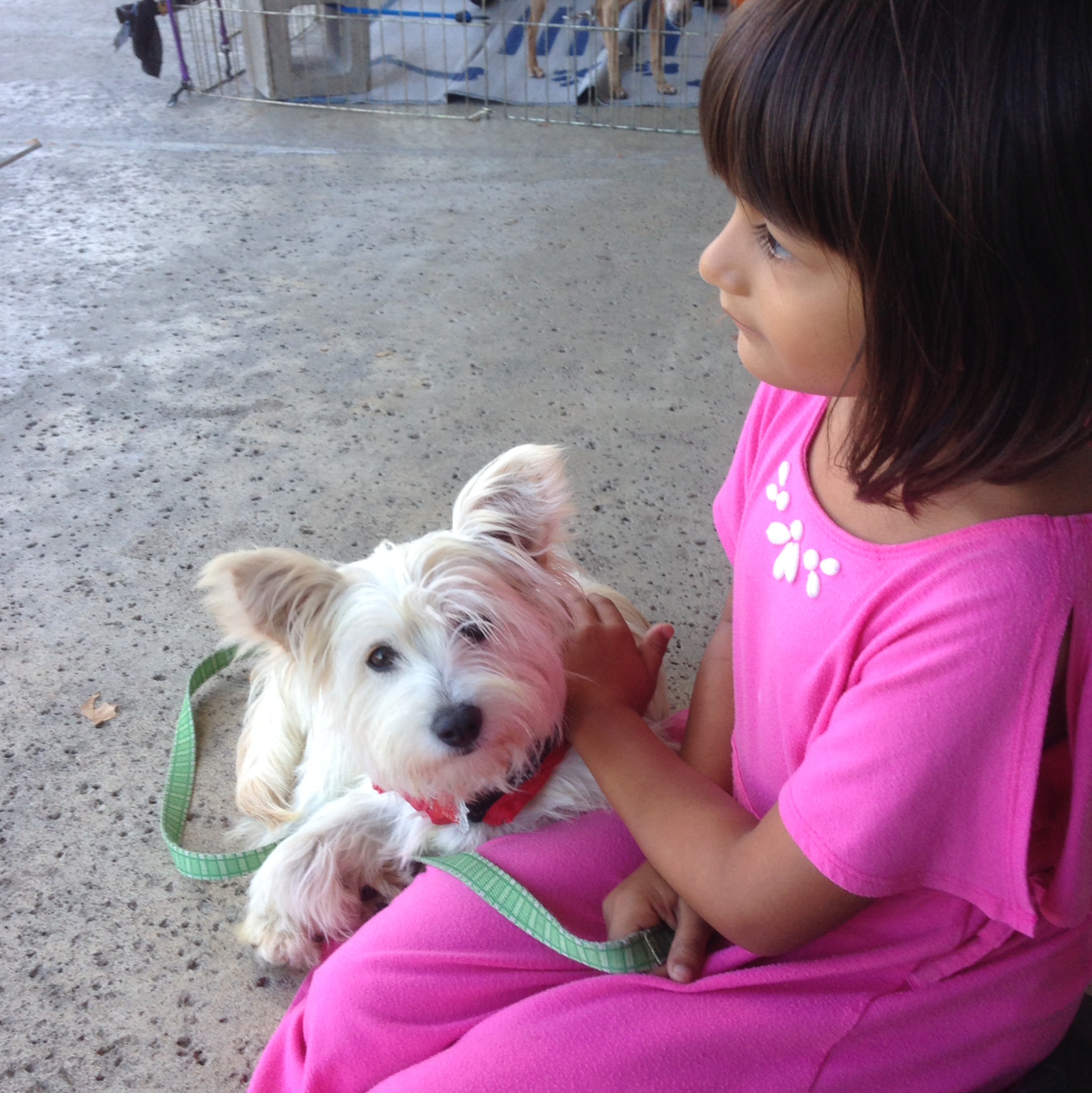 The woman who was fostering Claira was at the event. She told us that Claira was pretty shy and timid. They were originally weary of placing her with a family with young kids, particularly because Mateo is still young. But, luckily for us, Teo was tired (it was nap time) and just about asleep on Dennis’s shoulder for most of the time we were there. Sienna sat calmly and petted Claira, until she started to demonstrate behaviors that showed the volunteers that she was comfortable and happy.